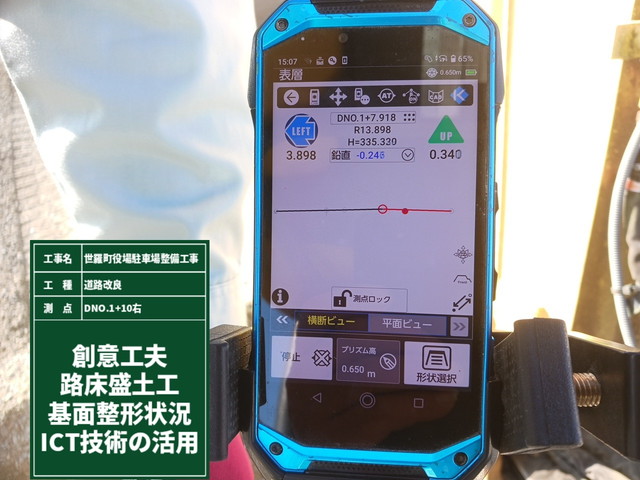 従来、2~3人で糸を張って路床、路盤の高さ測定をしていましたが、重機オペレーターのみで作業できます。