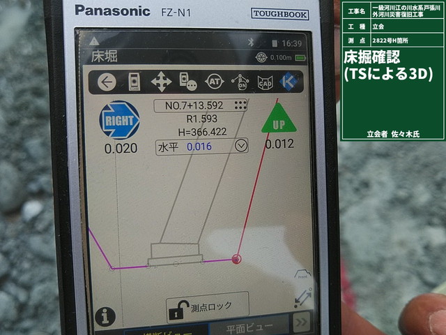 通常施工時、床掘り完了時に丁張設置してましたが、発注者協議で 3次元設定での確認とし丁張ナシで確認してもらっています。 よって、丁張設置時間を削減し直ちに基礎工に移ることができます。